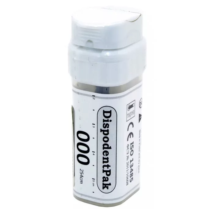Нить DispodentPak №000 предназначается для расширения бороздки до нужного уровня. Ее применение позволяет исключить кровотечение, правильно разместить реставрационный материал ниже десневого края. Нить DispodentPak не имеет пропитки, достаточно удобная в использовании, часто применяется для передних зубов. Данный материал может использоваться в процессе фиксации виниров, при слишком нежных или плотных тканях.