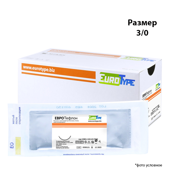 ЕВРОТЕФЛОН – инновационный нерассасывающийся стерильный хирургический шовный материал. Нить монофиламентная (мононить). Изготовлена из политетрафторэтилена (ПТФЭ). Имеет идеально гладкую поверхность. Обладает высокой гибкостью и прочностью. Нить ПТФЭ химически инертная, биоинертная. Длительное время сохраняет свои свойства. Не теряет прочность и упругость, отлично держит узел. Игла атравматическая Premium из нержавеющей стали, режущая, 3/8 окружности. Высокое качество полировки и специальное соединение нити снижает вероятность травмирования сшиваемых тканей.